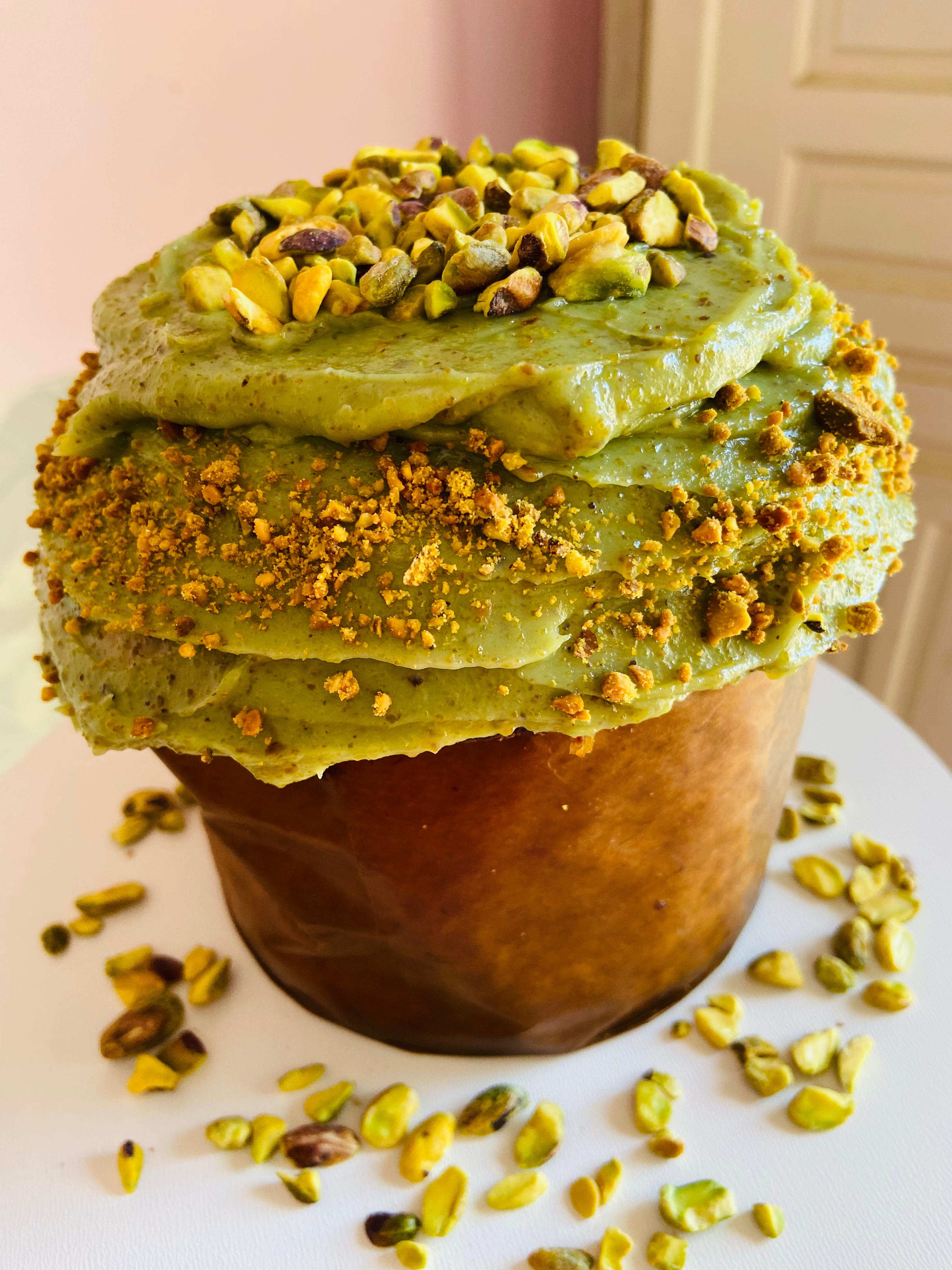 BOLO DE PISTACHE- Bolo na massa branca ou de chocolate com recheio de brigadeiro cremoso de pistache, bem molhadinho, com cobertura de chantininho e decorado com pistache.