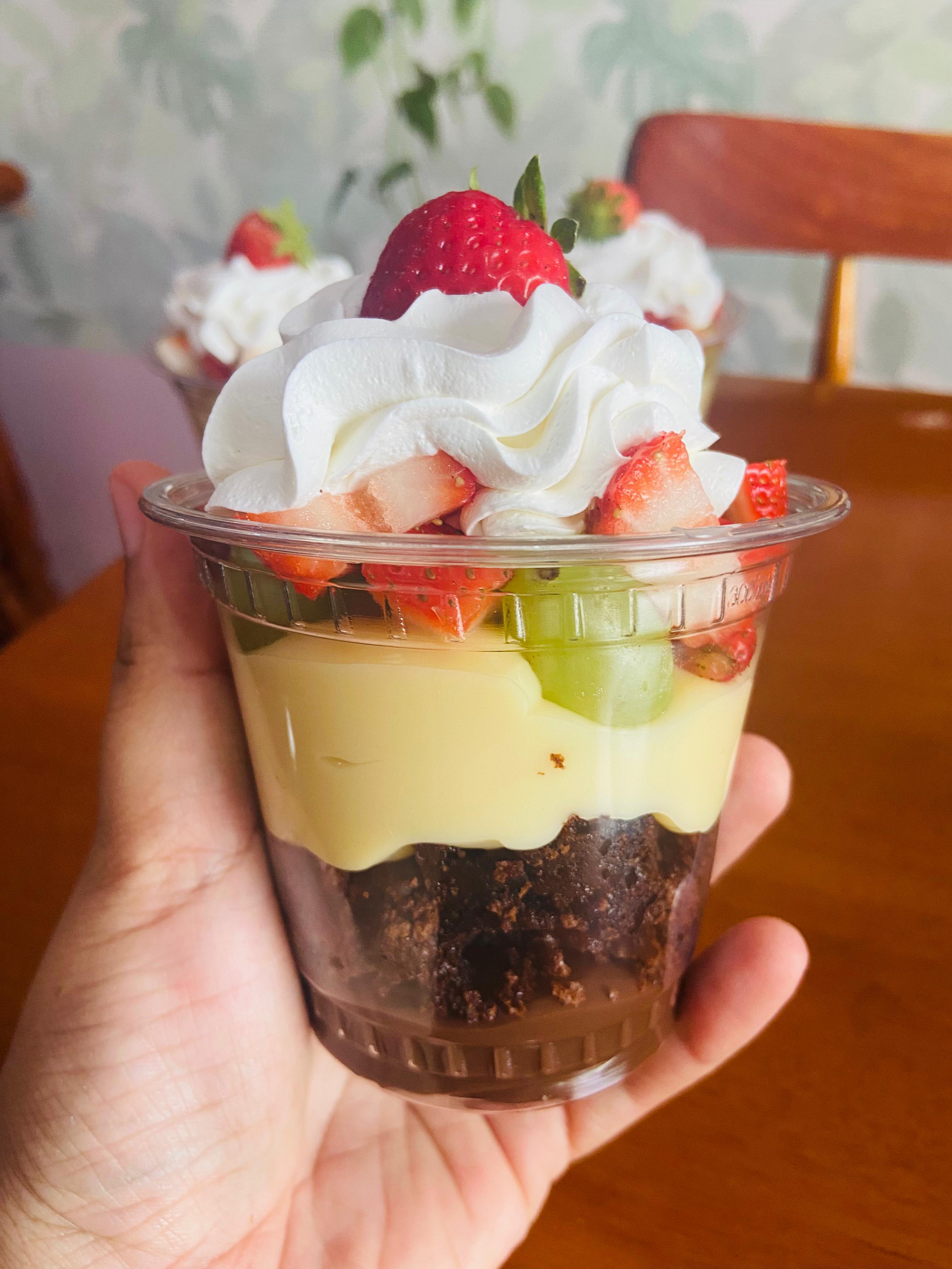 SOBREMESA DE MORANGO COM BROWNIE – Travessa de sobremesa com uma camada de morangos, uma camada de brigadeiro branco cremoso, com cobertura de brigadeiro tradicional cremoso e decorada com uva verde.