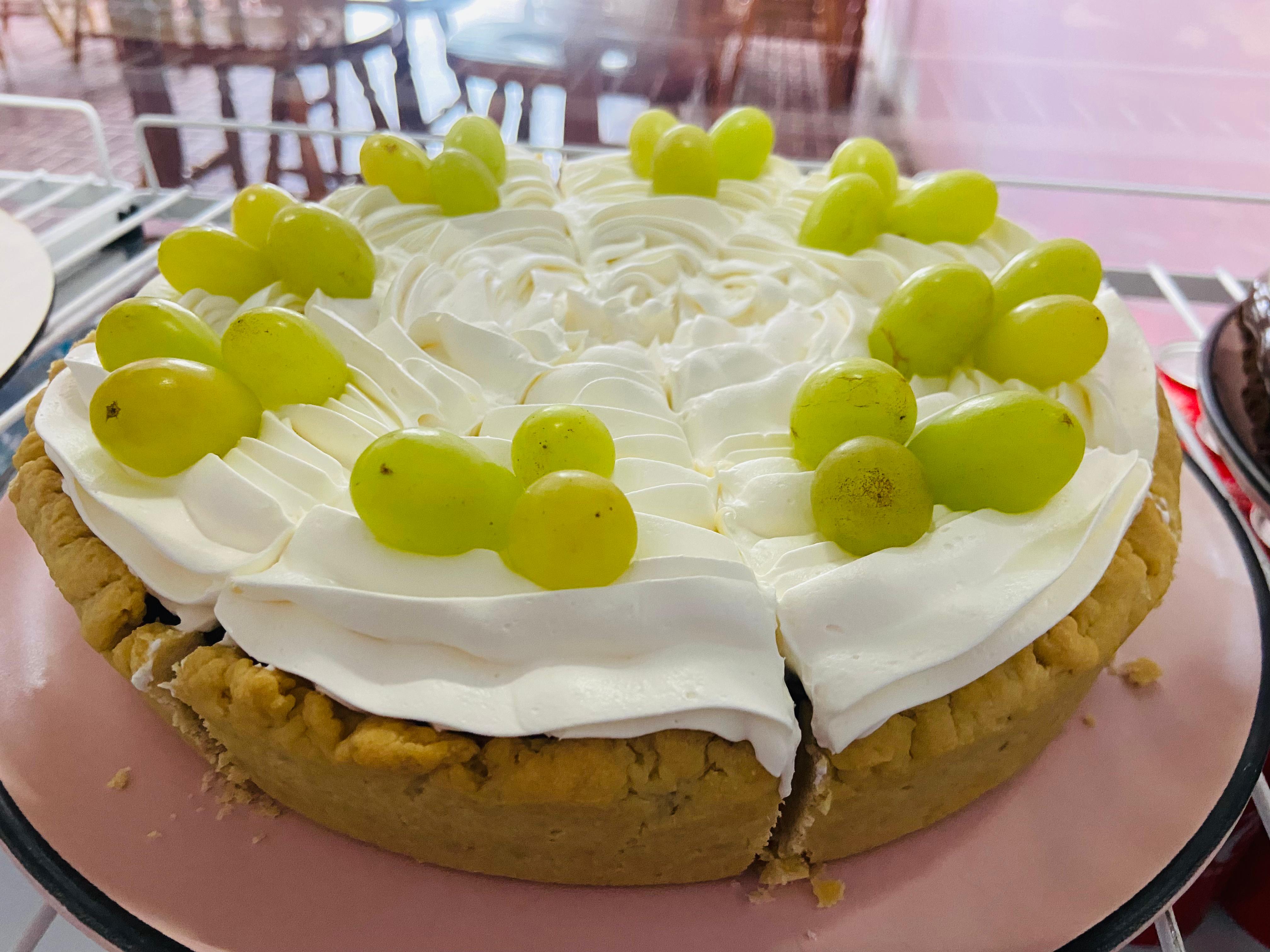BOLO DE NINHO COM UVA VERDE – Bolo na massa branca ou de chocolate com recheio de brigadeiro de leite ninho cremoso com uva verde ao meio, bem molhadinho, com cobertura de chantininho e decorado com uva verde.