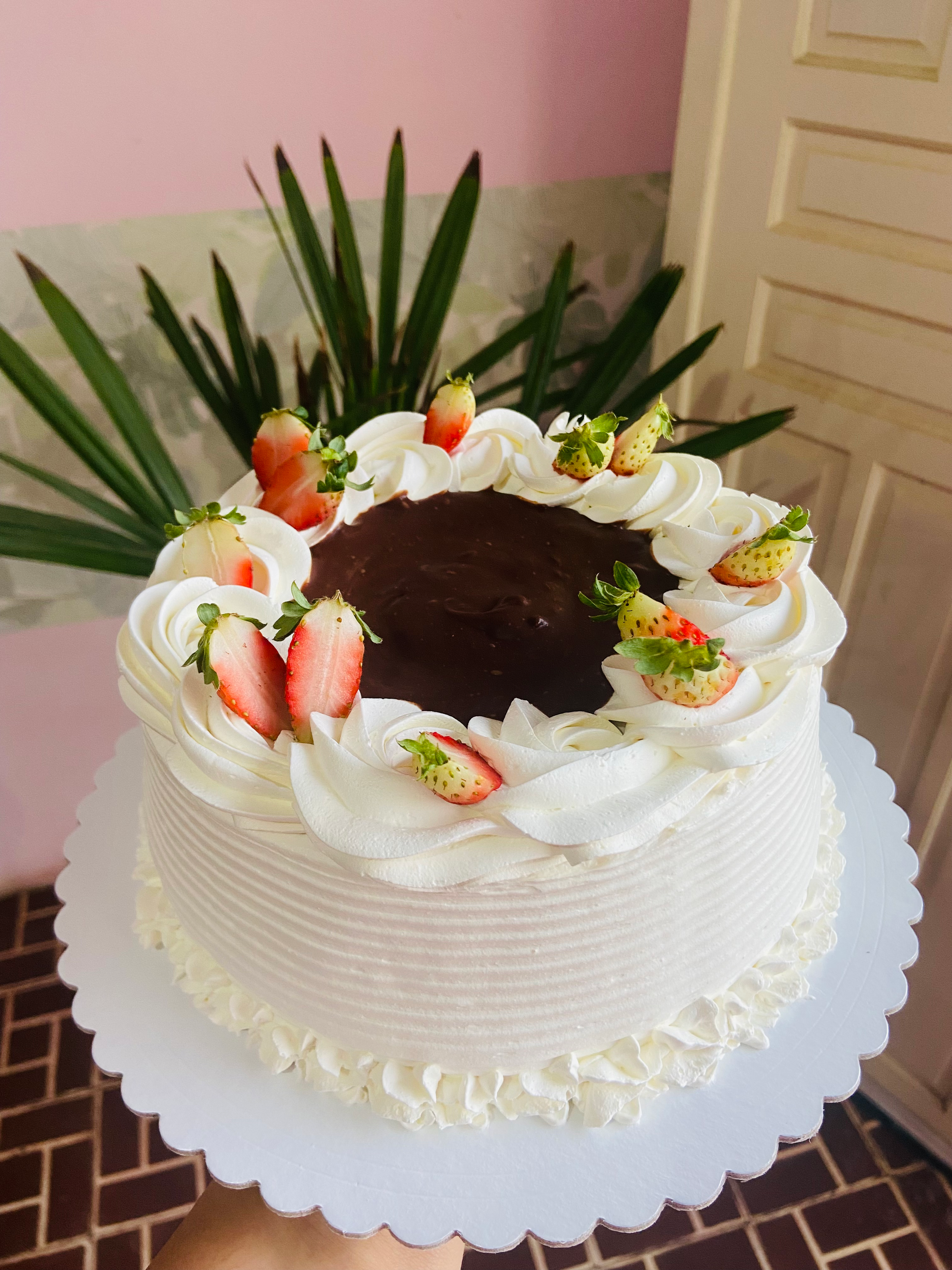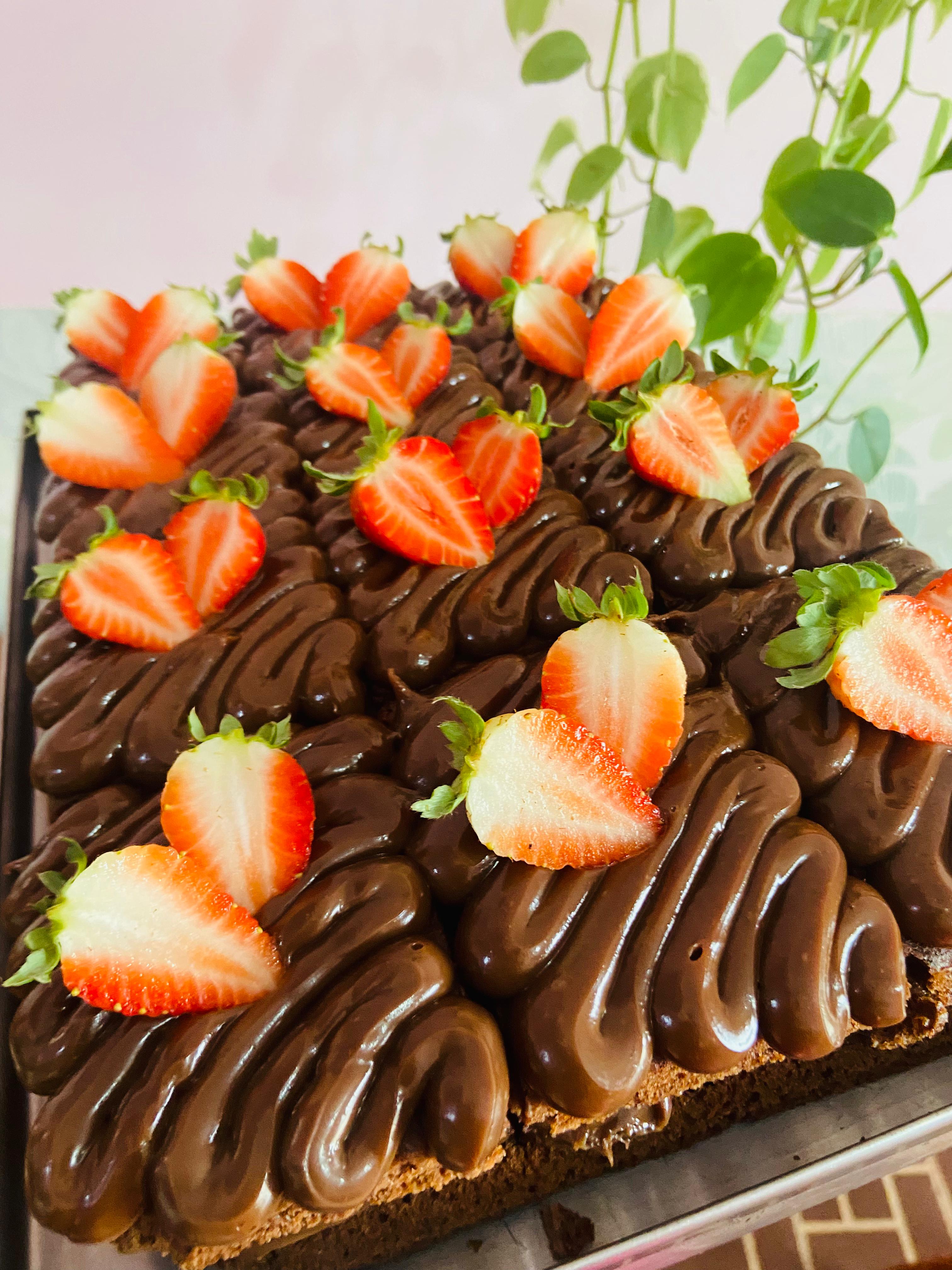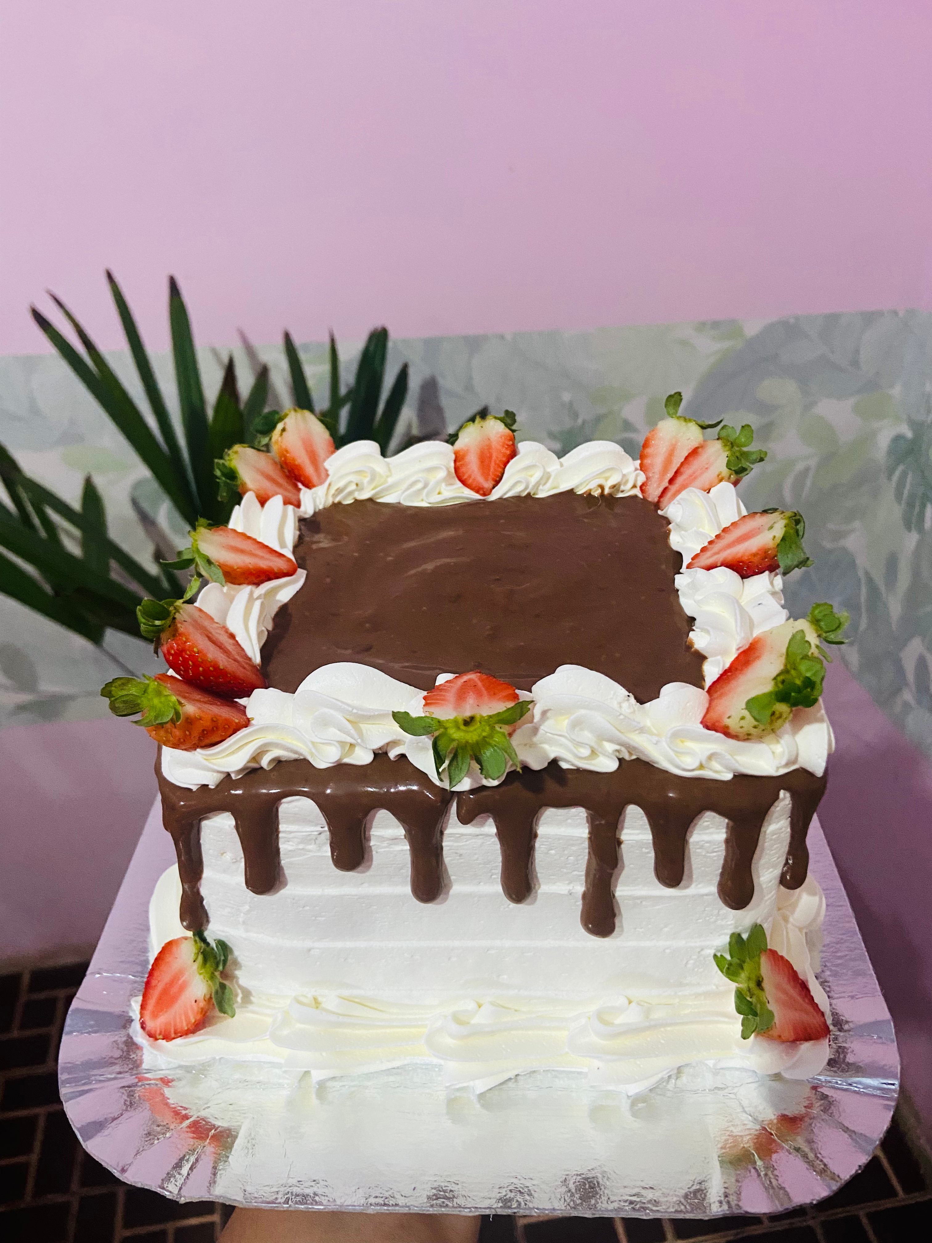 BOLO QUATRO LEITES – Bolo na massa branca ou de chocolate, com recheio de brigadeiro cremoso de leite em pó, leite condensado, creme de leite e leite de coco, bem molhadinho, com cobertura de chantininho e decorado com morangos.