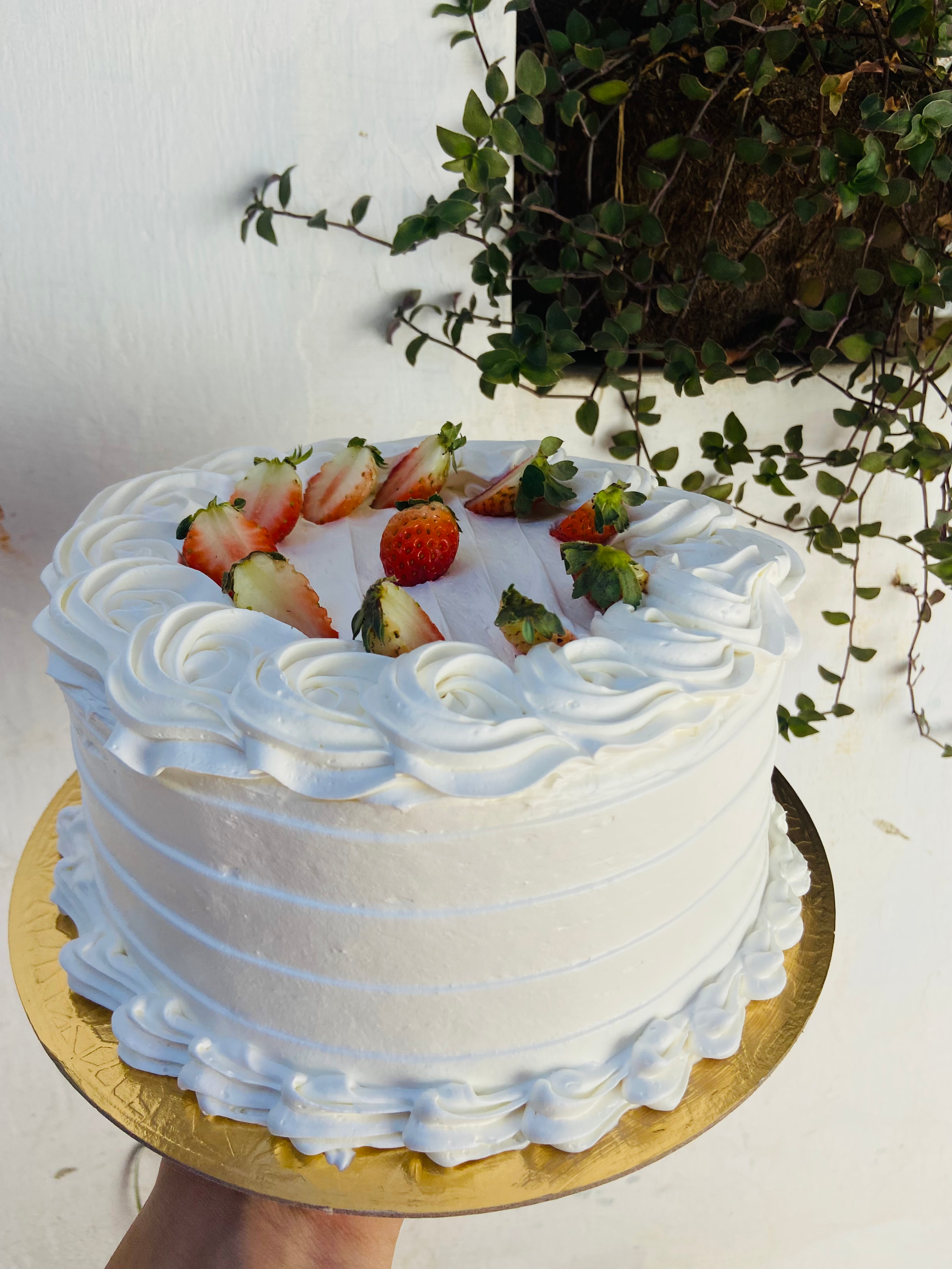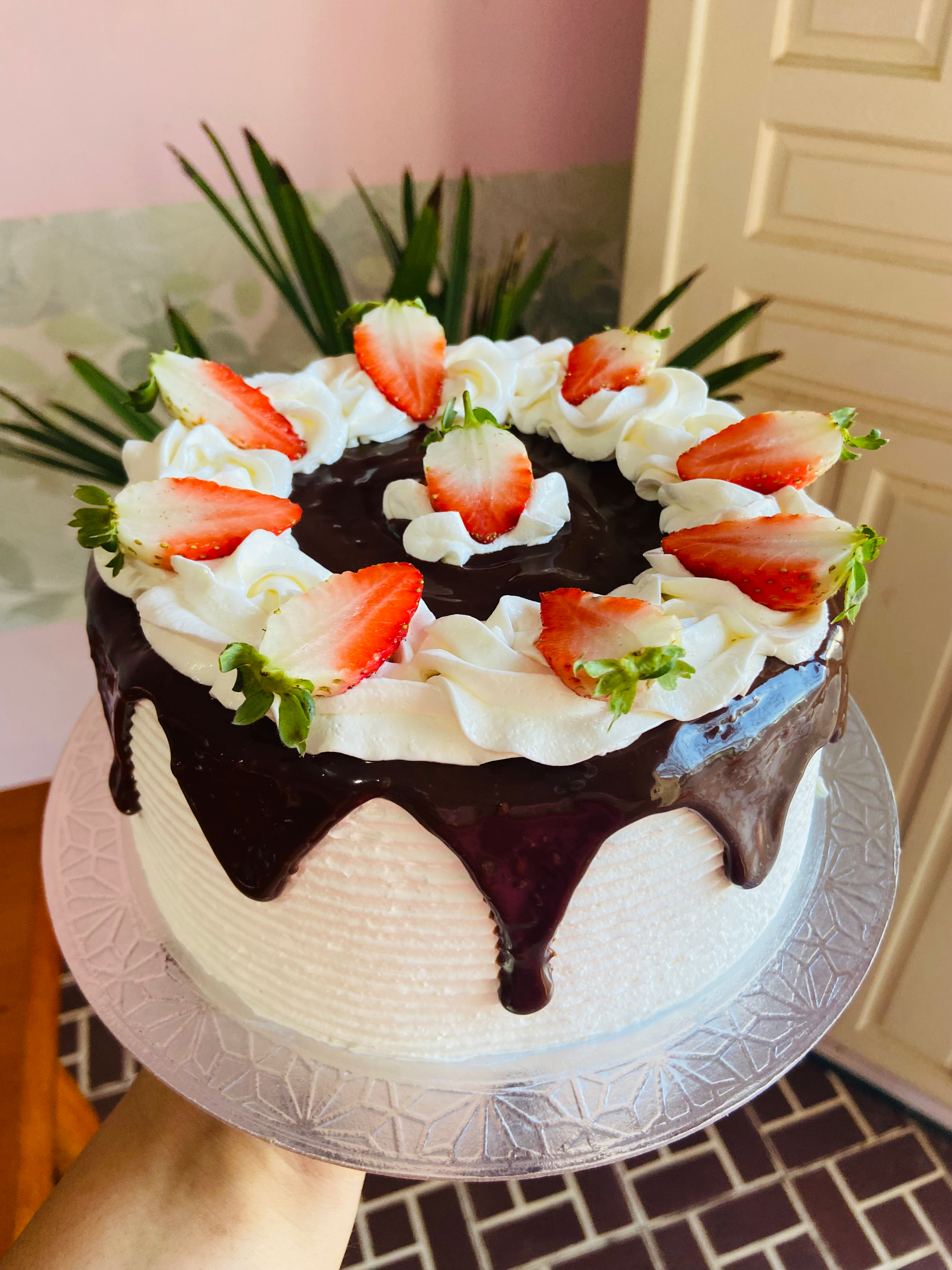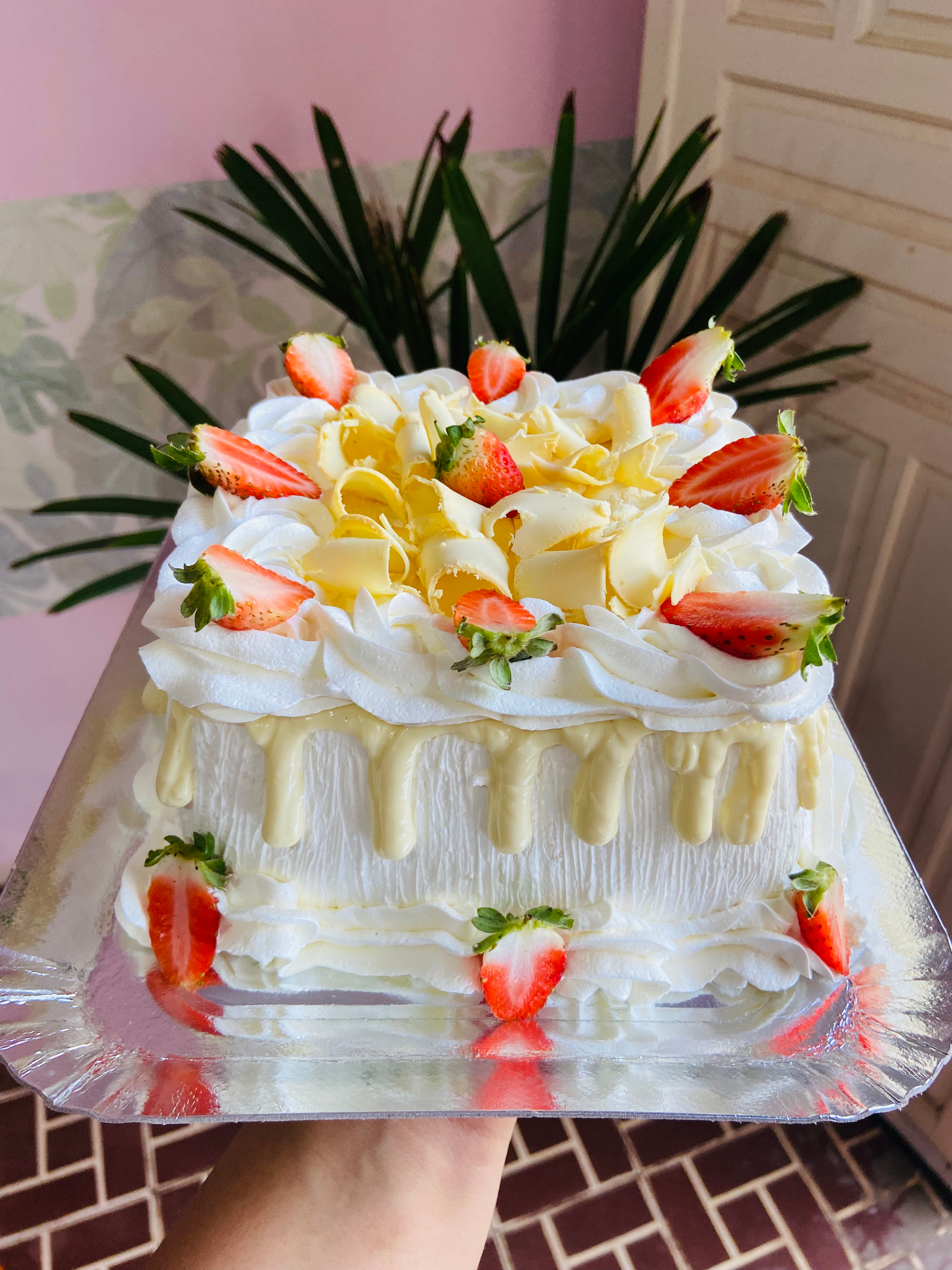 BOLO QUATRO LEITES – Bolo na massa branca ou de chocolate, com recheio de brigadeiro cremoso de leite em pó, leite condensado, creme de leite e leite de coco, bem molhadinho, com cobertura de chantininho e decorado com morangos.