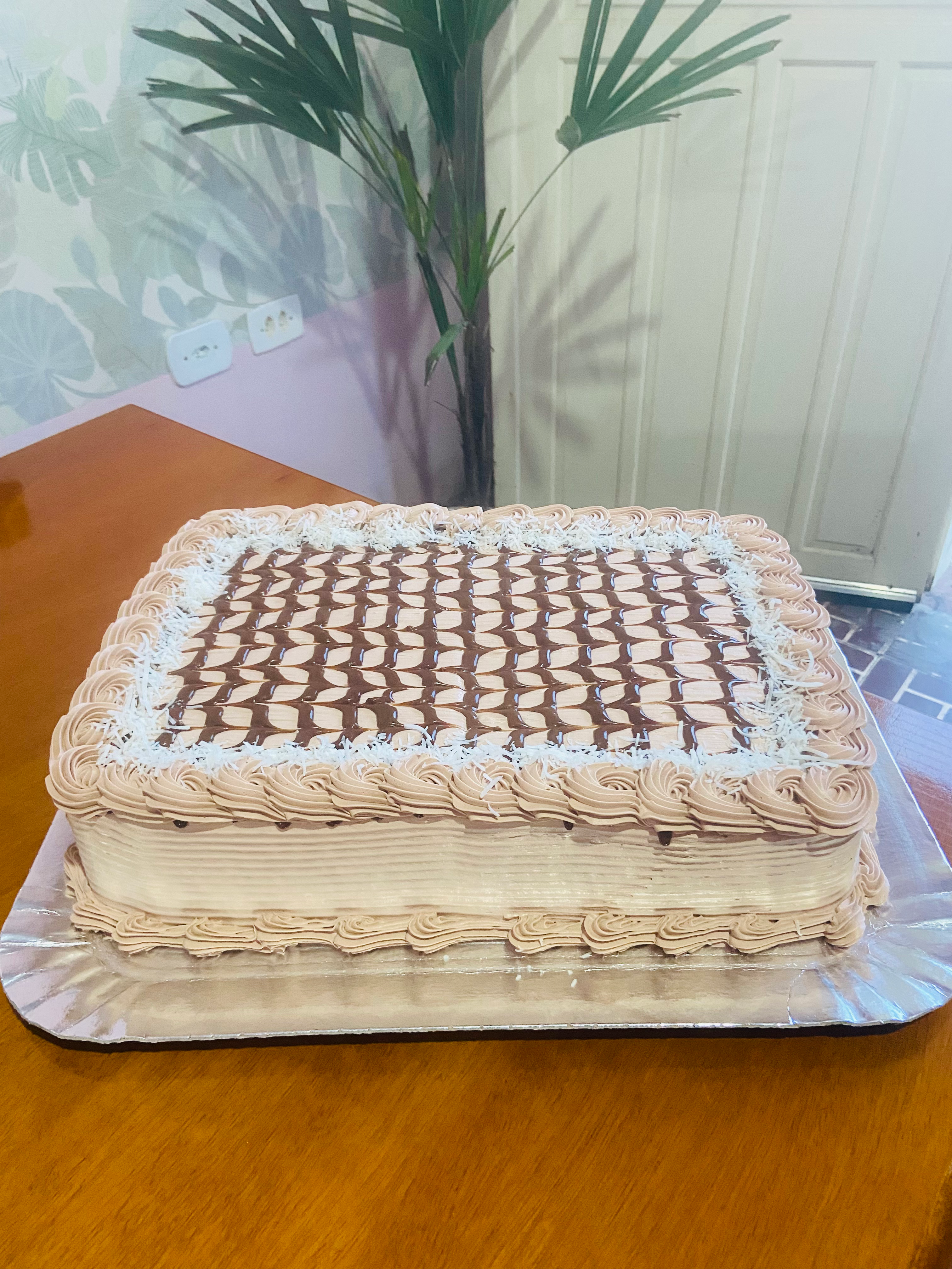 BOLO DE TRAVESSA PRESTIGÍO - Travessa com camadas alternadas de bolo de chocolate bem molhadinho e brigadeiro cremoso de coco, finalizado com chantininho e ganache de chocolate, decorado com coco em flocos.